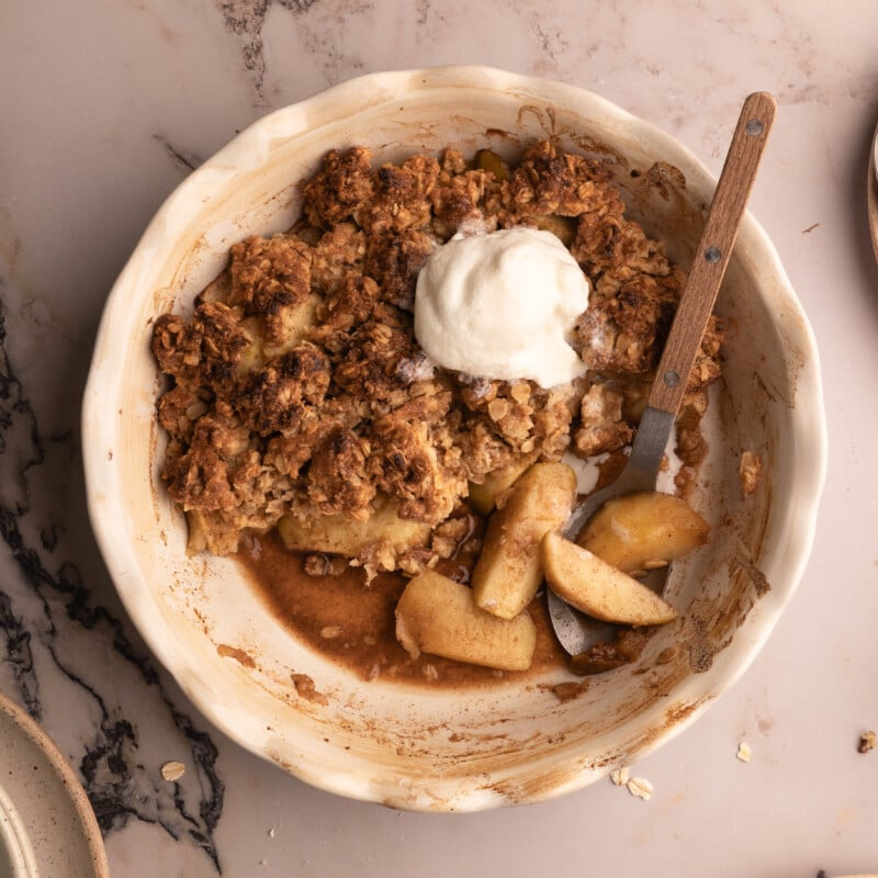 Serve it warm (ideally straight from the oven) with a big scoop of vanilla ice cream or a dollop of whipped cream. The hot-and-cold combo never gets old—and might just ruin you for every other apple dessert.