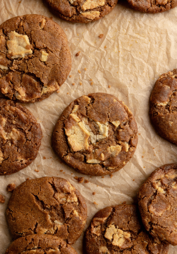 Top each cookie with a spoonful of crumble before baking. As they rise in the oven, the edges caramelize while the topping gets golden and crisp. When they’re done, sprinkle a little flaky salt and let them cool just enough to handle.